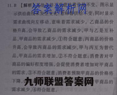 11.B【解析】其他条件不变意味着价格不变。图示显示供给曲线未发生变化,意味着供给不变:同时显示需求曲线向左移动,意味着需求减少。乙商品的价格升高,会导致乙商品的需求减少,甲与乙是互补品,甲商品的需求减少,①符合题意;丙商品的价格升高,会导致丙商品的需求减少,甲与丙互为替代品,甲商品的需求增加,②不符合题意:消费者对甲商品的偏好程度增强,会促使消费者增加对甲商品的需求,③不符合题意:消费者预期甲商品的价格将下降,会推迟人们对甲商品的需求,当前对甲商品的需求减少,④符合题意。