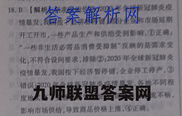 18,B【解析】供求影响价格,2020年金球新冠肺炎度夏情暴发,我国按下经济暂停健,部分企业和市场延期是开工开市,一些产品生产和供给受到影响,①正确;复“一些非生活必需品消费受抑制”反陕的是需求变化,不符合设问要求,排除②:2020年金球新冠肺炎疫情暴发,我国按下经济暂停键,企业停工停产,③错误;2020年全球新冠肺炎疫情暴发,各地不同程度地实施了交通运输管控措施,部分地区物流不畅,影响市场供给,导致商品价格上涨,④正确。