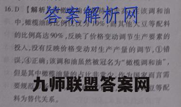 16,D【解析】因做榄油价格特续走高,在该调和油中,做榄油的比例仅仅为10%,而其他大豆等配料的比例高达90%,反映了价格变动调节生产要素的投人,没有反映价格变动对生产产量的调节,①错误,④正确:该调和油虽然被冠名为“做榄调和油”,但是其中做榄油量的占比非常少,作为国家面言需要规范市场秩序,③正确:②错误,橄榄与大夏等配料为精代关系。