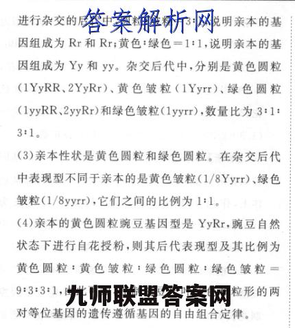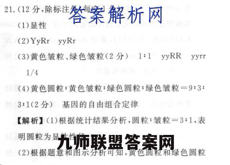 21.(12分,除标注外,每空1分)(1)显性(2)YyRr yyRr(3)黄色皱粒、绿色皱粒(2分)1:1yyRRyyrr1/4(4)黄色圆粒:黄色皱粒:绿色圆粒:绿色皱粒=9:3:3:1(2分)基因的自由组合定律【解析】(1)根据统计结果分析,圆粒皱粒=3:1,表明圆粒为显性性状。(2)根据题意和图示分析可知,黄色圆粒和绿色圆粒进行杂交的后代中,圆粒:皱粒=3:1,说明亲本的基因组成为Rr和Rr:黄色绿色=1:1,说明亲本的基因组成为Yy和yy。杂交后代中,分别是黄色圆粒(1YyRR、2YyRr)、黄色皱粒(1Yyrr)、绿色圆粒(1yyRR、2yyRr)和绿色皱粒(1yyrr),数量比为3:1:3:1。(3)亲本性状是黄色圆粒和绿色圆粒。在杂交后代中表现型不同于亲本的是黄色皱粒(1/8Yyrr)、绿色皱粒(1/8yyrr),它们之间的比例为11。(4)亲本的黄色圆粒豌豆基因型是YyRr,豌豆自然状态下进行自花授粉,则其后代表现型及其比例为黄色圆粒:黄色皱粒:绿色圆粒:绿色皱粒9:3:3:1,由此可知,控制豌豆子叶颜色和粒形的两对等位基因的遗传遵循基因的自由组合定律。