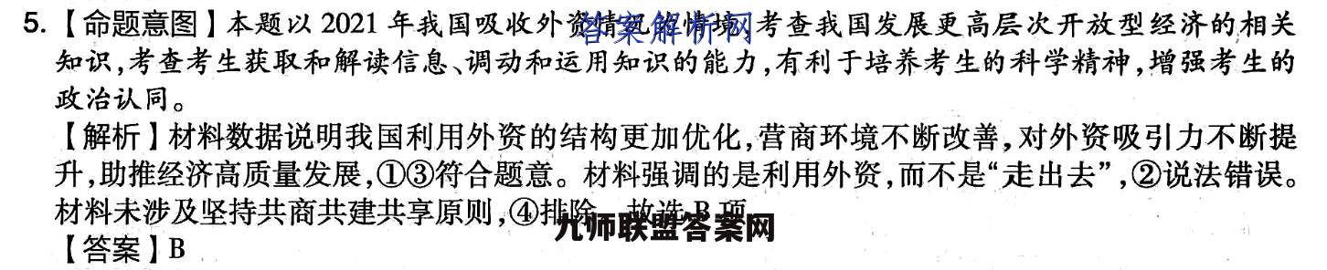 5.【命题意图】本题以2021年我国吸收外资情况为情境,考查我国发展更高层次开放型经济的相关知识,考查考生获取和解读信息、调动和运用知识的能力,有利于培养考生的科学精神,增强考生的政治认同。【解析】材料数据说明我国利用外资的结构更加优化,营商环境不断改善,对外资吸引力不断提升,助推经济高质量发展,①③符合题意。材料强调的是利用外资,而不是“走出去”,②说法错误。材料未涉及坚持共商共建共享原则,④排除。故选B项。【答案】B