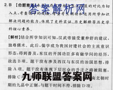 2.B【命题意图】本题以西汉将相与东汉功臣的对比为切入点,考查儒学的发展,考查考生调动和运用所学知识解决问题的能力,体现了史料实证、历史解释等历史学科核心素养。【解析】结合所学知识可知,汉武帝接受董仲舒的建议,独尊儒术。此后,儒学成为我国封建社会的主流意识形态,得到普及,东汉的开国功臣多有做学问的经历,故选B项。题干没有涉及西汉与东汉的治国思想,排除A项。题干没有体现下层民众的升迁之路被阻塞,排除C项。形成门阀政治的选官制度是魏晋南北朝时期的九品中正制,与题干时间不符,排除D项。