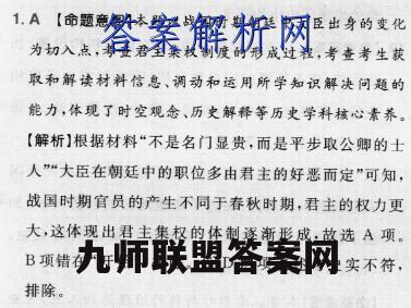 1,A【命题意图】本题以战国时期朝廷中大臣出身的变化为切入点,考查君主集权制度的形成过程,考查考生获取和解读材料信息、调动和运用所学知识解决问题的能力,体现了时空观念、历史解释等历史学科核心素养。【解析】根据材料“不是名门显贵,而是平步取公卿的士人”“大臣在朝廷中的职位多由君主的好恶而定”可知,战国时期官员的产生不同于春秋时期,君主的权力更大,这体现出君主集权的体制逐渐形成,故选A项。B项错在“开始”,排除。C、D两项表述与史实不符,排除。