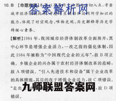 10.B【命题意图】本题以某著作中的图文为切入点,考查城市经济体制改革,考查考生调动和运用所学知识的能力,体现了时空观念、唯物史观、历史解释等历史学科核心素养。【解析】1984年,我国城市经济体制改革全面展开,其中心环节是增强企业活力,一改之前的僵化体制,因此1984年被称为“中国现代企业的元年”,故B项正确。乡镇企业的兴办属于农村经济体制改革的范畴,故A项错误。“引人先进技术和设备”属于企业改革的具体措施,其目的在于增强企业活力,故C项错误。“走出去”的发展战略在2000年正式提出,故D项错误。