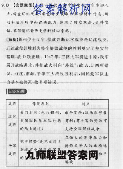 9.D【命题意图】本题以解放战争中的电报内容为切入点,考查过沈战役,考查考生获取和解读材料信息、调动和运用所学知识的能力,体现了时空观念、史料实证、家国情怀等历史学科核心素养。【解析】锦州位于辽宁,据此判断此次战役是辽沈战役。辽沈战役的胜利为整个解放战争的胜利奠定了坚实的基础,故D项正确。1947年,三路大军挺进中原,我军展开战略进攻,并把战火引向“外线”,故A、C两项错误。辽沈、淮海、平津三大战役胜利后,国民党军队主力基本被消灭,故B项错误,知识拓展战役作战原则特点关门打狗(先打锦州,最早发动,战场形势最辽沈关闭国民党军队外递有利;有丰富的资源可战役的陆上通道)支持全国解放战争在强大的军事压力和瓮中捉鳖(先完成对主平津傅作义等人的正确选要城市中国民党军队战役择下,北平实现了和平的包围,再发动进攻)解放续表战役作战原则特点国城打援(包围国民党淮海配合平津战役对国民军队,并对增援的国民战役党军队的包围党军队予以全歼)