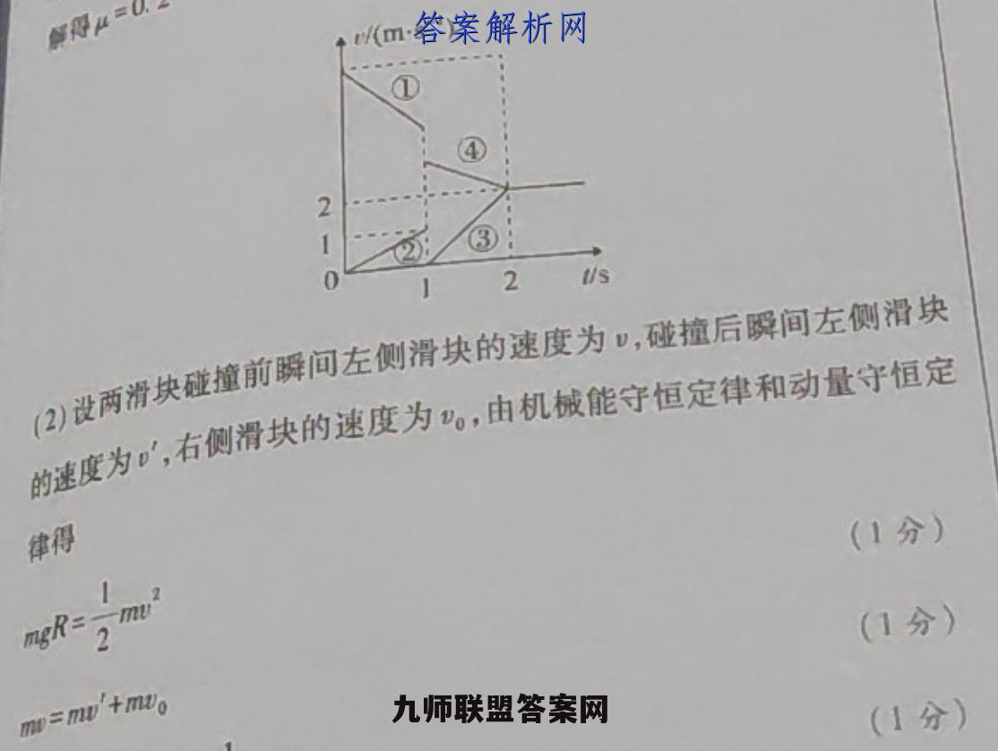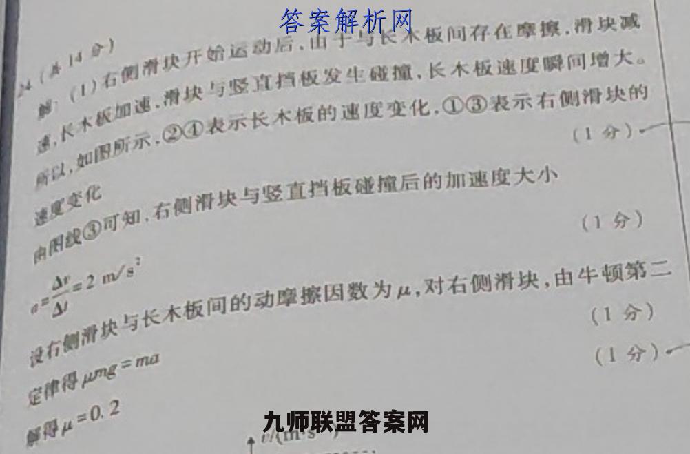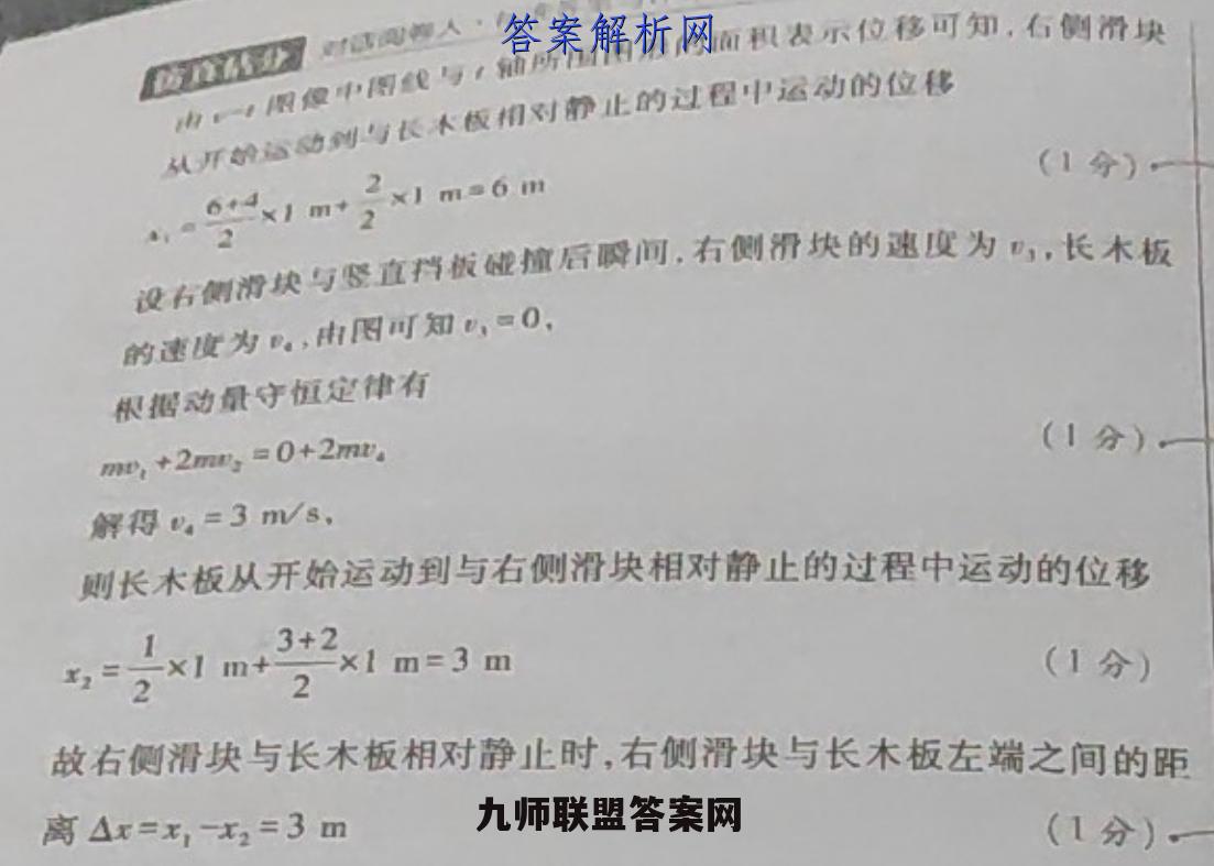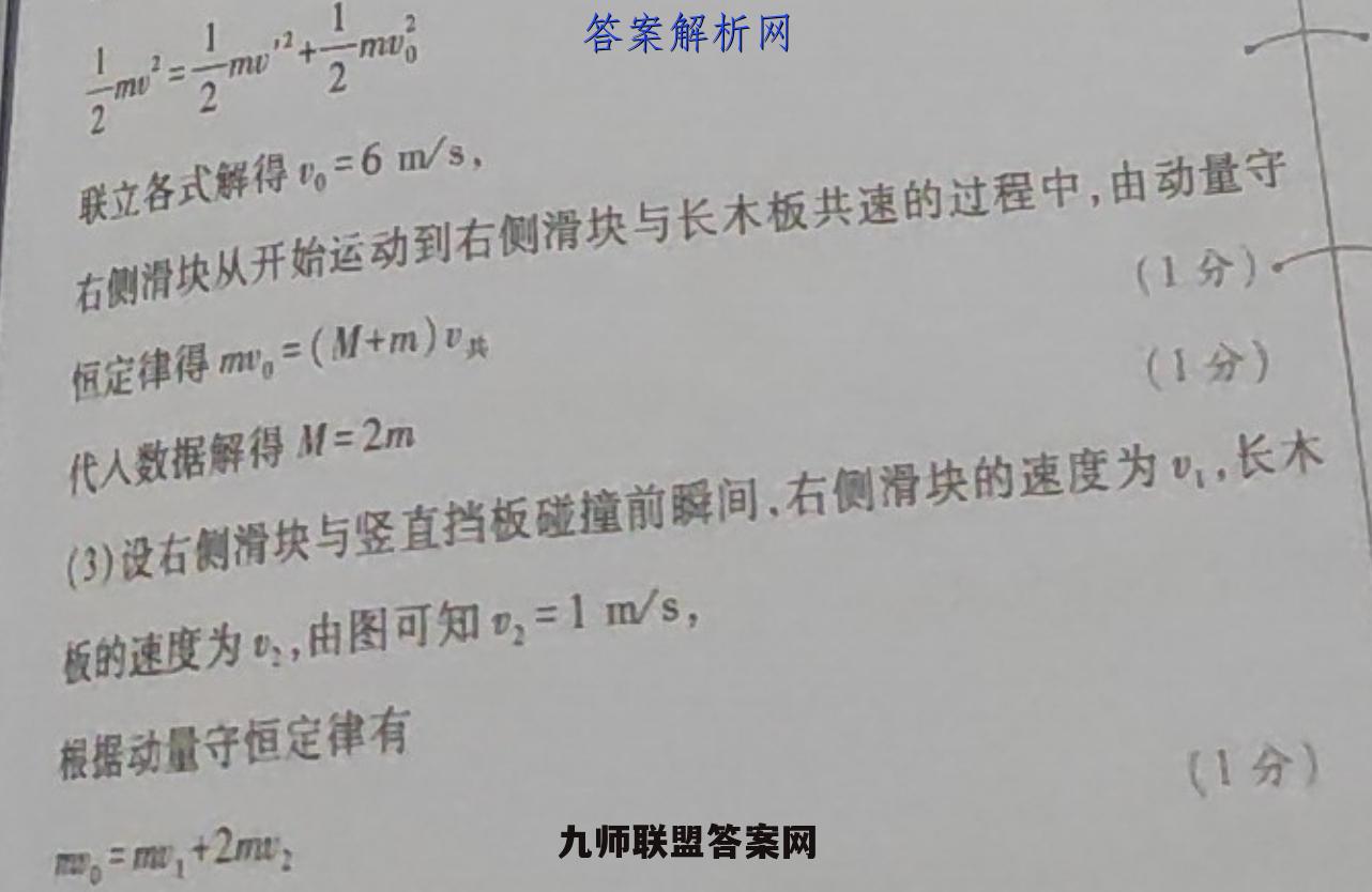 少小秋的运于与长木板间存在摩擦价块4(本月心)一农大气如巡带快与签直背位发生碰撞:长本板速度限间啦大。示大术木城的出生化表示有秋的(1分)户e③可知.右侧滑块与竖直挡板碰撞后的加速度大小速度变化(1分】t22 m/s'行都御处本级问的动摩城因致为,对右的指快,由年椒第(1分)》定律得mg=ma(1分)月得4=02+/(ms)得μF/(ms)22)设两滑块登撞前瞬间左侧滑块的速度为,碰撞后瞬间左侧滑块02/s的速度为,右侧滑块的速度为,由机械能守恒定律和动量守恒定律得(1分】(1分》mm=mu'十mg(1分),2+一m0、2=222联立各式解得=6m/s,右侧滑块从开始运动到右侧滑块与长木板共速的过程中,由动量守(1分)恒定律得m,=(M+m)"共(1分)代人数据解得M=2m(3)设右侧滑块与竖直挡板碰撞前瞬间,右侧滑块的速度为),长木板的速度为,由图可知,=1m/s,根据动量守恒定律有(1分】网,m,+2m解得=4m/s,:-图复图与,的两阳形的积表示位移可知,右侧滑块从开的运动到与长木饭相对静止的过图中运动的位移x1mx1m6m(1分)设右侧滑快与袋直背饭虚植后膜间,有侧滑块的速度为,长木板2的速度为D,由图可知,=0,根据动量守恒定律有m,+2mn,=0+2m解得,=3m/s,则长木板从开始运动到与右侧滑块相对静止的过程中运动的位移与1m21m=3m(1分)故右侧滑块与长木板相对静止时,右侧滑块与长木板左端之间的距离△x=x,-x2=3m(1分)