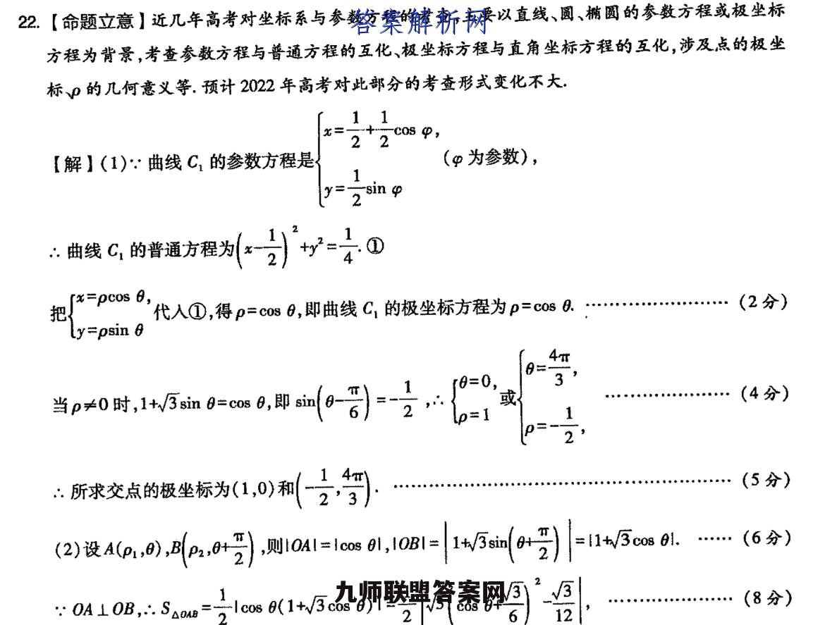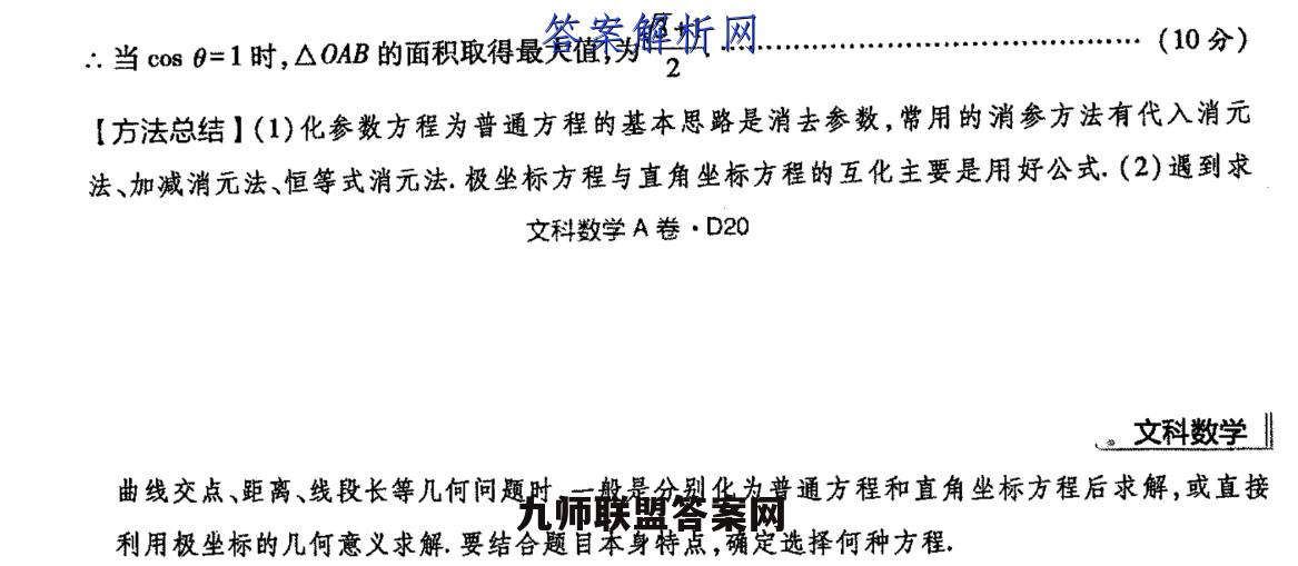 22.【命题立意】近几年高考对坐标系与参数方程的考查,主要以直线、圆、椭圆的参数方程或极坐标方程为背景,考查参数方程与普通方程的互化、极坐标方程与直角坐标方程的互化,涉及点的极坐标p的几何意义等.预计2022年高考对此部分的考查形式变化不大11+C089,22【解】(1),曲线C的参数方程是(p为参数),y=2 sin:曲线C,的普通方程为习)+y2=子①[x=pcos 6,把代入①,得p=cos0,即曲线C,的极坐标方程为p=cos8.…(2分)Ly=psin 68=当p0时,1w血=o6,即0君子03或…(4分)p=12“所求交点的极坐标为(1,0)利分智(5分)((2)设4o),ap,0+),则10al=ioas61,108l=h5sne+)=1h5cas9i.…(6分)0A10B,Sao=号1cs(1+W3cos01=as月'-(8分)12三当os0=1时,△0MB的面积取得最大值,为,+1(10分)2【方法总结】(1)化参数方程为普通方程的基本思路是消去参数,常用的消参方法有代入消元法、加减消元法、恒等式消元法.极坐标方程与直角坐标方程的互化主要是用好公式.(2)遇到求文科数学A卷·D20。文科数学曲线交点、距离、线段长等几何问题时,一般是分别化为普通方程和直角坐标方程后求解,或直接利用极坐标的几何意义求解,要结合题目本身特点,确定选择何种方程,