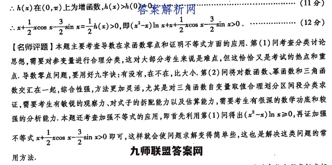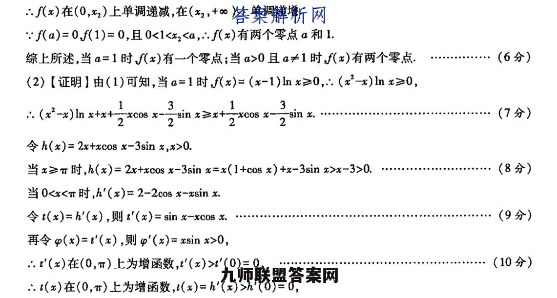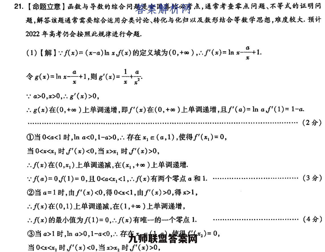 21.【命题立意】函数与导数的综合问题是全国卷的必考点,通常考查零,点问题、不等式的证明问题,解答该题通常需要综合运用分类讨论、转化与化归以及数形结合等数学思想,难度较大,预计2022年高考仍会按照此规律进行命题,(1)【解】fx)=(xa)lhxf(x)的定义域为(0,+o),…f(x)=lnxa+1令6h1,则g(e)=立号2a>0,x>0,.g'(x)>0,∴g(x)在(0,+o)上单调递增,即f'(x)在(0,+o)上单调递增,且f'(a)=naf'(1)=1-a.…(2分)①当0 0,∴.存在x1E(a,1),使得f'(x)=0,当0 x1时f'(x)>0,f(x)在(0,x1)上单调递减,在(1,+)上单调递增.f(a)=0,f代1)=0,且0 0,得x>1,∴.f(x)在(0,1)上单调递减,在(1,+∞)上单调递增,∴f(x)的最小值为f(1)=0,∴f(x)有唯一的一个零点1.(4分)③当a>1时,lna>0,1-a<0,∴.存在x2∈(1,a),使得f'(x2)=0,当0 x2时f'(x)>0,∴f(x)在(0,x2)上单调递减,在(x2,+∞)上单调递增.fa)=0,f代1)=0,且0<1 0且a≠1时f代x)有两个零点.…(6分)(2)【证明】由(1)可知,当a=1时,f(x)=(x-1)lnx≥0,∴.(x2-x)lnx≥0,1313(-)1nx+x+2cosx-25in≥x+2osx-2in名……(7分2h(x)=2x+xcos x-3sin x,x>0.当x≥T时,h(x)=2x+xcos x-3sinx=x(1+co8x)+x-3sinx>x-3>0.…(8分)当0 0,∴t'(x)在(0,)上为增函数,(x)>t(0)=0,…(10分)∴t(x)在(0,r)上为增函数,t(x)=h'(x)>h'(0)=0,.h(x)在(0,π)上为增函数,h(x)>h(0)=0,…(11分)1132in=2()>0,即(x-)血xt+2*os4sinx>0,…(12分)2【名师评题】本题主要考查导数在求函数零点和证明不等式方面的应用.第(1)问考查分类讨论思想,需要对参变量进行合理分类,这对大部分考生来说是难点,但这恰恰又是考试的热点和重点.导数零点问题,要用好九宇诀:有没有,在不在,比大小,第(2)问将对数函数、暴函数和三角函数交汇在一起,综合性强,方法更加灵活,尤其是对三角函数自变量取值合理划分区间段分类求证,需要考生有敏锐的观察力、对式子的拆配能力以及估算能力,需要考生有很深的数学功底和较强的分析能力.本题还考查加强不等式的应用,即首先利用第(1)问得出(x2-x)lx≥0,再证加强不等式+20s×2in>0即可,这样就会使问题求解变得简单些,这也是解决这类问题的常3用方法