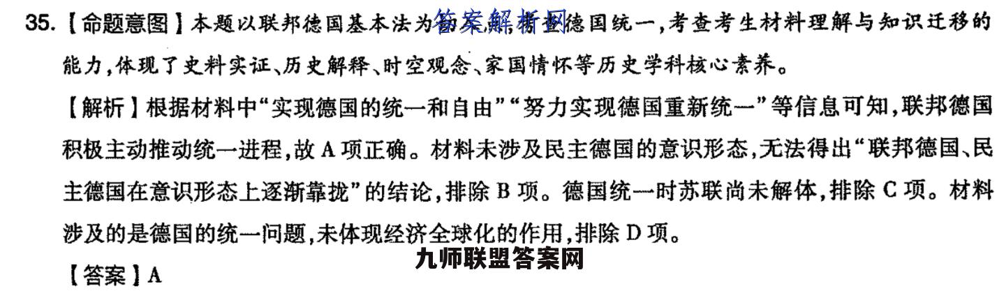 35.【命题意图】本题以联邦德国基本法为切入点,考查德国统一,考查考生材料理解与知识迁移的能力,体现了史料实证、历史解释、时空观念、家国情怀等历史学科核心素养。【解析】根据材料中“实现德国的统一和自由”“努力实现德国重新统一”等信息可知,联邦德国积极主动推动统一进程,故A项正确。材料未涉及民主德国的意识形态,无法得出“联邦德国、民主德国在意识形态上逐渐靠拢”的结论,排除B项。德国统一时苏联尚未解体,排除C项。材料涉及的是德国的统一问题,未体现经济全球化的作用,排除D项。【答案】A