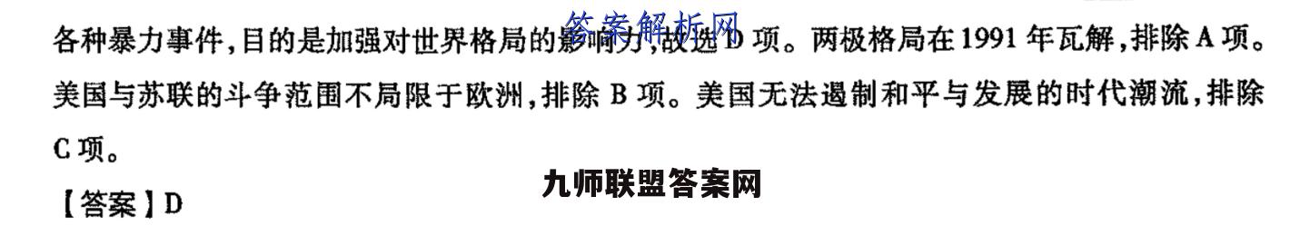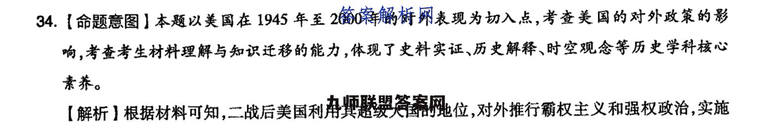 34.【命题意图】本题以美国在1945年至2000年的对外表现为切入,点,考查美国的对外政策的影响,考查考生材料理解与知识迁移的能力,体现了史料实证、历史解释、时空观念等历史学科核心素养。【解析】根据材料可知,二战后美国利用其超级大国的地位,对外推行霸权主义和强权政治,实施各种暴力事件,目的是加强对世界格局的影响力,故选D项。两极格局在1991年瓦解,排除A项。美国与苏联的斗争范围不局限于欧洲,排除B项。美国无法遏制和平与发展的时代潮流,排除C项。【答案】D