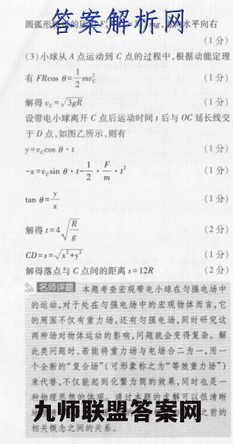25.(1)2(2)35mg,方向水平向右e412R【命题意图】本题考查带电小球在电场中的运动,意在考查考生的模型建构能力、分析综合能力和应用等效的思想方法解题的能力。【解析】(1)小球在B点处于静止状态,受重力mg、电场力E和轨道对小球的弹力F,画出受力分析图如图甲所示。根据受力平衡有mg=Eqsin0(2分)解得电场强度的大小E=2m延(1分)D甲乙(2)对小球进行受力分析可知电场力和重力的合力F=飞=√5mg,方向水平向右(1分)tan 6小球从A点运动到B点的过程中,支持力不做功,只有F敏正功,根据动能定理有FR=了一(1分)小球在B点时根据牛顿第二定律有哈F、-F=mR(1分)解得轨道对小球的弹力大小F、=33mg(1分】根据牛顿第三定律可知,小球从A点运动到B点时对理到综合圆弧形轨道的压力F=F、=33mg,方向水平向右(1分)(3)小球从A点运动到C点的过程中,根据动能定理有FRcos0=2m(1分)解得e=√3gR(1分设带电小球离开C点后运动时间:后与OC延长线交于D点,如图乙所示,则有y=UcC0s0·t(1分-x=vcsin0·2‘m(1分)tan8s之(1分)解得t=4(2分)CD=s=星+7(1分)解得落点与C点间的距离s=12R(2分)今名师评塑本题考查宏观带电小球在匀强电场中的运动,对于处在匀强电场中的宏观物体而言,它的周围不仅有重力场,还有匀强电辆,同时研究这两种场对物体运动的影有,间问题就会变得复杂。解此类问题时,若能将重力场与电场合二为一,用一个全新的“复合场”(可形象称之为“等效重力场”)来代替,不仅能起到化繁为筒的效果,同时也是一种物理思想的体现。通过本题的求解可以很清晰地理清“等效重力场”中的部分概念与复合之前的相关概念之间的关系。