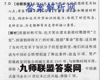 7.D【命题意图】本题以包天笑与陈冷血的思想转变为切入,点,考查辛竅革命的背景,考查考生获取和解读材料信息、调动和运用所学知识的能力,体现了时空观念、史料实证、历史解释等历史学科核心素养。【解析】依据材料可知,包天笑在清末新政时期鼓吹“立宪”,到清朝即将灭亡的时候,提倡“革命”思想,这反映了在时代变革下知识分子的思想转变,他们的这些活动为中国社会转型创造了與论条件,故选D项。资产阶级政党同盟会的诞生是在1905年,与材料时间不符,排除A项。B项表述与材料主旨不符,排除。中国新式报刊业在19世纪末已经兴起,排除C项。