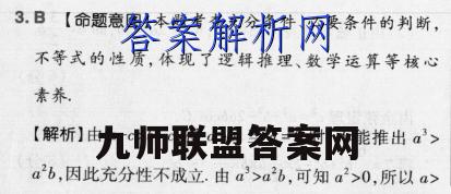 3,B【命题意图】本题考查充分条件、必要条件的判断,不等式的性质,体现了逻辑推理、数学运算等核心素养,【解析】由a-c>b-c,得a>b.当a=0时,不能推出a3>a2b,因此充分性不成立.由a3>a2b,可知a2>0,所以a>b,则a-c>b-c,因此必要性成立.所以“a-c>b-c”是“a3>ab”的必要不充分条件.故选B.