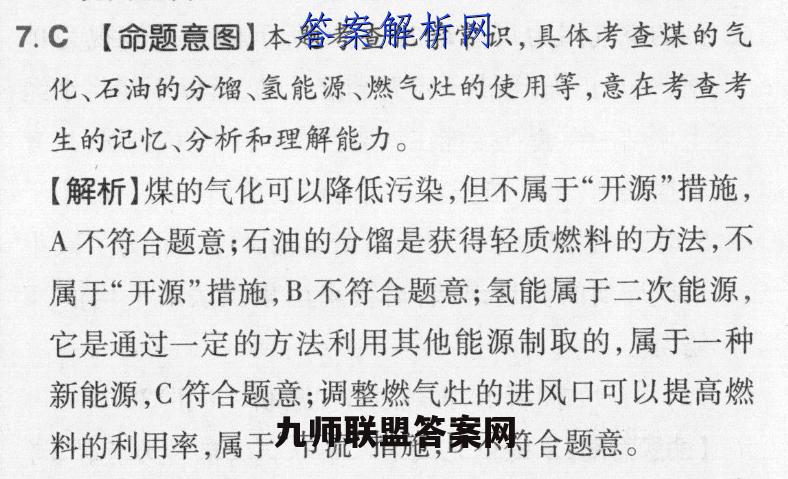 7.C【命题意图】本题考查化学常识,具体考查煤的气化、石油的分馏、氢能源、燃气灶的使用等,意在考查考生的记忆、分析和理解能力。【解析】煤的气化可以降低污染,但不属于“开源”措施,A不符合题意;石油的分馏是获得轻质燃料的方法,不属于“开源”措施,B不符合题意;氢能属于二次能源,它是通过一定的方法利用其他能源制取的,属于一种新能源,C符合题意;调整燃气灶的进风口可以提高燃料的利用率,属于“节流”措施,D不符合题意。