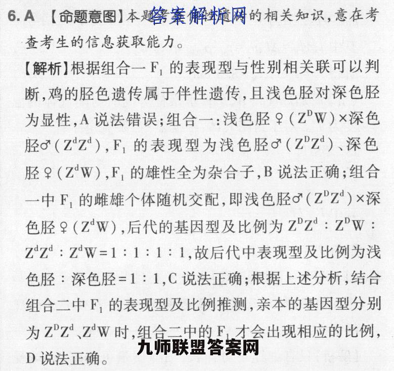 6.A【命题意图】本题考查伴性遗传的相关知识,意在考查考生的信息获取能力。【解析】根据组合一F,的表现型与性别相关联可以判断,鸡的胫色遗传属于伴性遗传,且浅色胫对深色胫为显性,A说法错误;组合一:浅色胫(Z°W)×深色胫d(ZZ),F,的表现型为浅色胫d(ZZ)、深色胫(ZW),F,的雄性全为杂合子,B说法正确;组合一中F,的雌雄个体随机交配,即浅色胫d(ZZ)×深色胫(ZW),后代的基因型及比例为ZZ:Z”W:ZZ:ZW=1:1:1:1,故后代中表现型及比例为浅色胫:深色胫=1:1,C说法正确;根据上述分析,结合组合二中F,的表现型及比例推测,亲本的基因型分别为Z”Z、ZW时,组合二中的F,才会出现相应的比例,D说法正确。