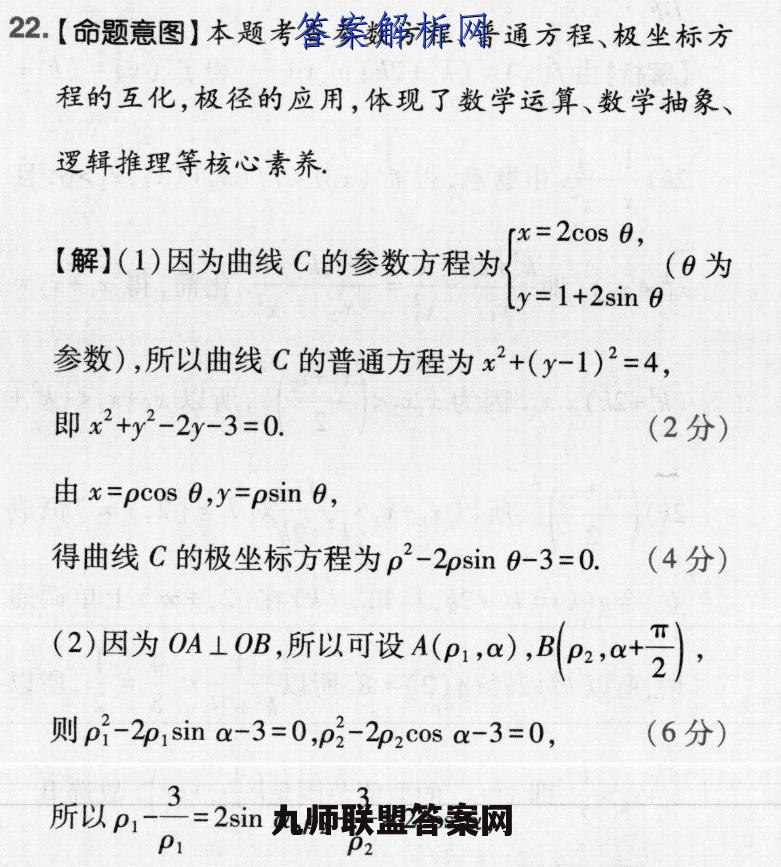 22.【命题意图】本题考查参数方程、普通方程、极坐标方程的互化,极径的应用,体现了数学运算、数学抽象、逻辑推理等核心素养x=2c0s0,【解】(1)因为曲线C的参数方程为{-1+2sng(0为参数),所以曲线C的普通方程为x2+(y-1)2=4,即x2+y2-2y-3=0.(2分)由x=pcos0,y=psin0,得曲线C的极坐标方程为p2-2psin0-3=0.(4分)》(2)因为0A10B,所以可设A(p,a),Bp,a+2)pi-2p:sin a-3=0,p2-2p2cos a-3=0,(6分)3所以p1-。3=2sin a,P2=2cos a,所以e,4(8分)整理,得on别=16,即A02一+1o40g=16因为1AB1=3,所以1+91610A1210B129解得10A1·10B1=S√771(10分)