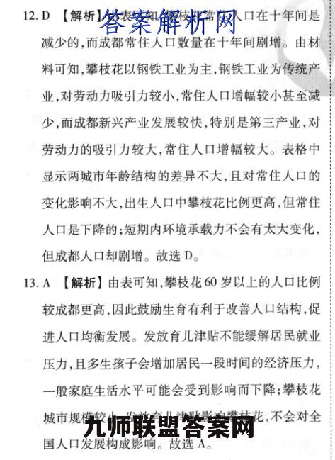 12.D【解析】由表可知,攀枝花常住人口在十年间是减少的,而成都常住人口数量在十年间剧增。由材料可知,攀枝花以钢铁工业为主,钢铁工业为传统产业,对劳动力吸引力较小,常住人口增幅较小甚至减少,而成都新兴产业发展较快,特别是第三产业,对劳动力的吸引力较大,常住人口增幅较大。表格中显示两城市年龄结构的差异不大,且对常住人口的变化影响不大,出生人口中攀枝花比例更高,但常住人口是下降的:短期内环境承载力不会有太大变化,但成都人口却剧增。故选D。13.A【解析】由表可知,攀枝花60岁以上的人口比例较成都更高,因此鼓励生育有利于改善人口结构,促进人口均衡发展。发放育儿津贴不能缓解居民就业压力,且多生孩子会增加居民一段时间的经济压力,一般家庭生活水平可能会受到影响而下降:攀枝花城市规模较小,发放育儿津贴影响攀枝花,不会对全国人口发展构成影响。故选A。