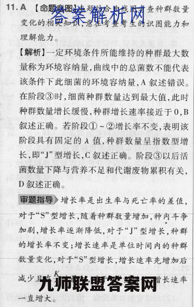 11.A【命题意图】本题结合曲线图考查种群数量变化的相关知识,意在考查考生的识图能力和理解能力。【解析】一定环境条件所能维持的种群最大数量称为环境容纳量,曲线中的总菌数不能代表该条件下此细菌的环境容纳量,A叙述错误。在阶段③时,细菌种群数量达到最大值,此时种群数量增长缓慢,种群增长速率接近于0,B叙述正确。若阶段①~②增长率不变,表明该阶段具有固定的入值,种群数量呈指数型增长,即“J”型增长,C叙述正确。阶段③以后活菌数量下降与营养不足和代谢废物累积有关,D叙述正确。审题指导》增长率是出生率与死亡率的差值,对于“S”型增长,随着种群数量增加,种内斗争加剧,增长率逐渐降低,对于“J”型增长,种群的增长率不变;增长速率是单位时间内的种群数量变化,对于“S”型增长,增长速率先增加后减少且在今时最大,对于“丁”型增长,增长速率一直增大。