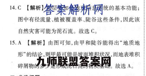 14.C【解析】图层叠加是地理信息系统的基本功能;图中有径流量、植被覆盖率、陡谷这些条件,因此该自然灾害可能为泥石流。故选C。15.A【解析】由图可知,由甲和陡谷能得出“地质地形”的结论,则甲最可能是坡面堆积状况,而地表堆积碎屑物的多少是形成泥石流的物质基础。故选A。