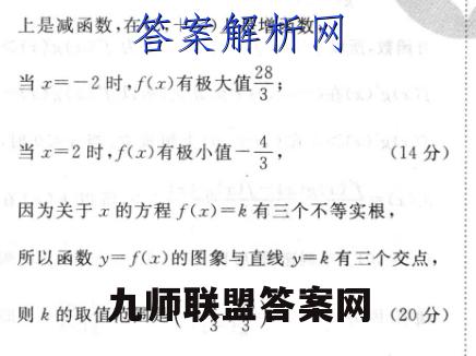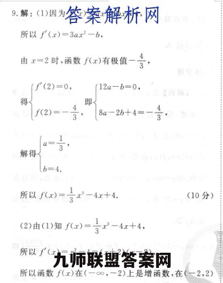 9.解:(1)因为f(x)=ax3-bx+4,所以f(x)=3ax2-b,由x=2时,函数)有极值一专,f(2)=0,12a-b=0,【移得即f(2)=-38a-2b+4=-43,1解得a=b=4.所以f)=名-4x+4(10分)(2)由1)知fx)=专r-4x+4,所以f(x)=x2-4=(x+2)(x-2),所以函数f(x)在(一∞,一2)上是增函数,在(一2,2)上是减函数,在(2,十∞)上是增函数,当z=一2时,f)有极大值9,当=2时,f代)有极小值-子(14分)因为关于x的方程f(x)=k有三个不等实根,所以函数y=f(x)的图象与直线y=k有三个交点,则的取值范围是(一专,婴)(20分)