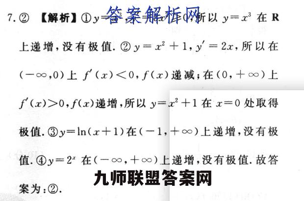 7.②【解析】①y=x3,y=3x2≥0,所以y=x3在R上递增,没有极值.②y=x2十1,y=2x,所以在(一∞,0)上f(x)<0,f(x)递减;在(0,十∞)上f(x)>0,f(x)递增,所以y=x2+1在x=0处取得极值.③y=ln(x十1)在(一1,十∞)上递增,没有极值.④y=2在(一∞,十∞)上递增,没有极值.故答案为:②