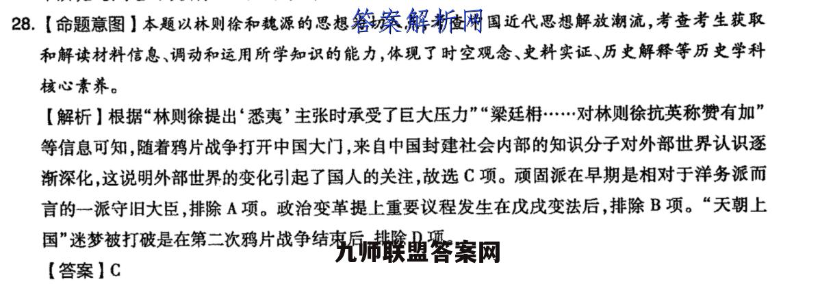28.【命题意图】本题以林则徐和魏源的思想为切入点,考查中国近代思想解放潮流,考查考生获取和解读材料信息、调动和运用所学知识的能力,体现了时空观念、史料实证、历史解释等历史学科核心素养。【解析】根据“林则徐提出‘悉夷’主张时承受了巨大压力”“梁廷相…对林则徐抗英称赞有加”等信息可知,随着鸦片战争打开中国大门,来自中国封建社会内部的知识分子对外部世界认识逐渐深化,这说明外部世界的变化引起了国人的关注,故选C项。顽固派在早期是相对于洋务派而言的一派守旧大臣,排除A项。政治变革提上重要议程发生在戊戌变法后,排除B项。“天朝上国”迷梦被打破是在第二次鸦片战争结束后,排除D项。【答案】c