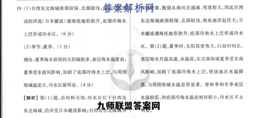 19.(1)台湾东北海域南部较深、北部较浅;由南向北流深线密集,数值从南向北递减、弯度较大,因此台湾动的洋流(日本暖流)遇海底地形抬升,底部冷海水东北海域南部较深、北部较浅,海底地形起伏大;日上泛形成冷水区。(6分)本暖流遇海底地形抬升,底部冷海水上泛形成冷水(2)季节:夏季。(1分)区。第(2)题,夏季时,太阳高度角大,白昼时间长,理由:夏季海水获得的太阳辐射多,表层海水温度高;表层海水升温迅速,水温高;东北部海域夏季受东南夏季受东南风影响,加剧了底部冷海水上泛,与周围风影响,加剧了底部冷海水上泛,使该地区水温降海域温差大,冷水区最明显。(4分)低,与周围海域水温差异显著。春秋季和冬季表层【解析】第(1)题,由材料可知,冷水区位于台湾岛水温较低,和底部冷海水温差相对较小,冷水区不太东北海域,沿岸受日本暖流影响;台湾岛东北海域等明显。