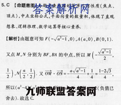 5.C【命题意图】本题考查椭圆的简单几何性质(焦点、顶点),中点坐标公式,平面向量的数量积,体现了直观想象、逻辑推理、数学运算等核心素养【解析】由题意可知F(-√a-1,0),A(a,0),B(0,1).又点M,N分别为B即,H的中点所以M(.行引又丽}444所以(a2-4)(a2+3)=0,所以a2=4,解得a=2(负值已舍去).故选C.