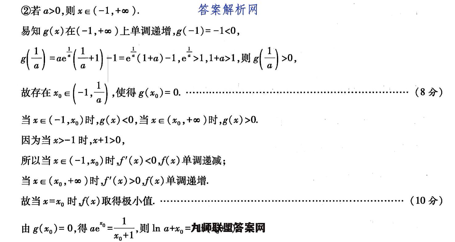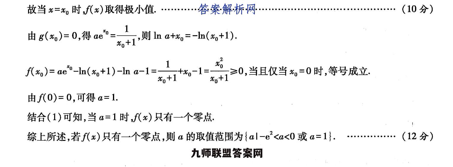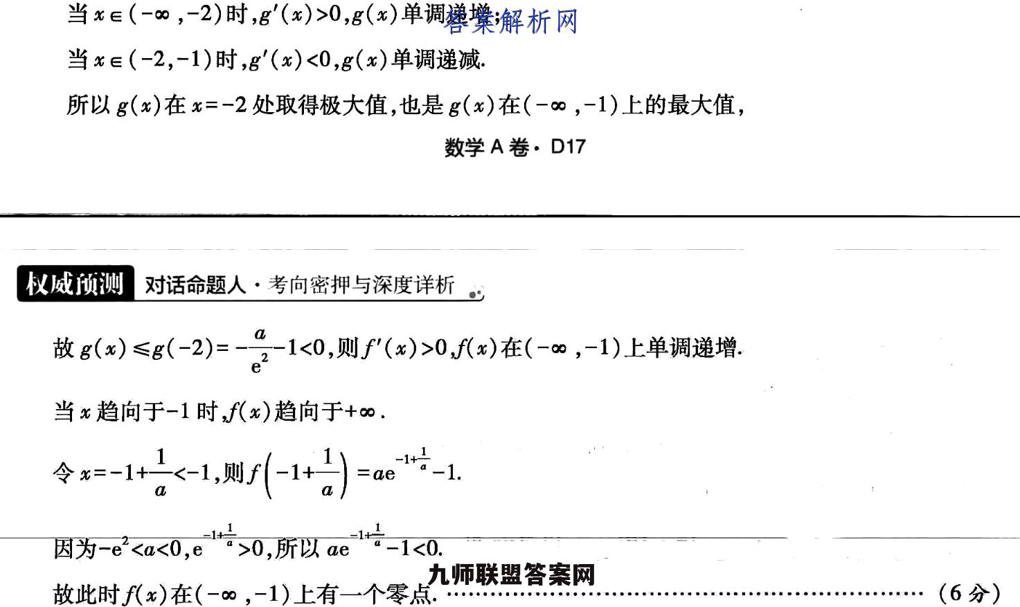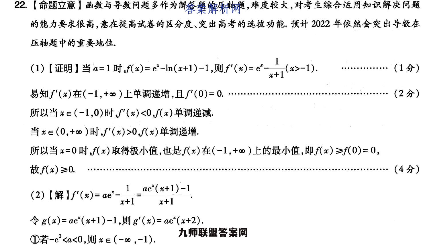 22.【命题立意】函数与导数问题多作为解答题的压轴题,难度较大,对考生综合运用知识解决问题的能力要求很高,意在提高试卷的区分度、突出高考的选拔功能.预计2022年依然会突出导数在压轴题中的重要地位,(1)【证明】当a=1时x)=e-h(x+1)-1,则f'()=e中7(>-l1).…(1分)易知f'(x)在(-1,+∞)上单调递增,且f(0)=0.…(2分)所以当x∈(-1,0)时f'(x)<0,f(x)单调递减.当x∈(0,+o)时,f'(x)>0,f(x)单调递增:所以当x=0时,f(x)取得极小值,也是f(x)在(-1,+∞)上的最小值,即f(x)≥f(0)=0,故f(x)≥0.(4分)(2)【解】f'(x)=ae-1=ae(x+1)-1x+1x+1令g(x)=ae*(x+1)-1,则g'(x)=ae*(x+2).①若-e2 0,g(x)单调递增;当x∈(-2,-1)时,g'(x)<0,g(x)单调递减。所以g(x)在x=-2处取得极大值,也是g(x)在(-∞,-1)上的最大值,数学A卷·D17权威预测对话命题人·考向密押与深度详析心放g()≤(-2)=2-1<0,则f()>0)在(-,-1).上单调递增当x趋向于-1时f(x)趋向于+o.令x=-11,则(1+)=a片-1因为-e2 0,所以ae1+-1<01+故此时f(x)在(-∞,-1)上有一个零点.…(6分)②若a>0,则x∈(-1,+0).易知g(x)在(-1,+∞)上单调递增,g(-1)=-1<0,4)=ae日+小-1e(1a)-1,ei1,o>1,则日0,放存在e(-1,)使得g(xo)=0.…(8分)当x∈(-1,xo)时,g(x)<0,当x∈(xo,+)时,g(x)>0.因为当x>-1时,x+1>0,所以当x∈(-1,x。)时,f'(x)<0,f(x)单调递减;当x∈(x,+∞)时,f'(x)>0,f(x)单调递增.故当x=x时f(x)取得极小值.(10分)由8o}=0,得ae7则h0*,=-h,+1).故当x=x。时f(x)取得极小值.(10分)由g()=0,得ae=11则nat=-h(%+1.7,1三f(*o)=ae0-In(%o+1)-In a-1=-I+1≥0,当且仅当,=0时,等号成立由f(0)=0,可得a=1.结合(1)可知,当a=1时,f(x)只有一个零点.综上所述,若f(x)只有一个零点,则a的取值范围为{al-e2