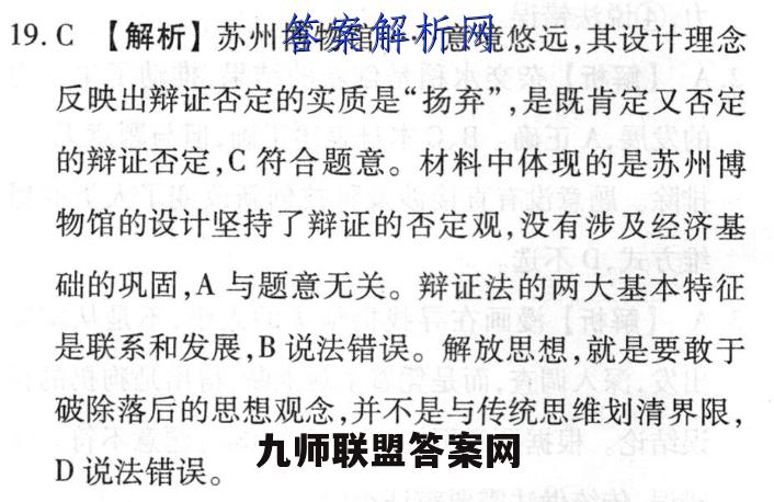 19.C【解析】苏州博物馆…意境悠远,其设计理念反映出辩证否定的实质是“扬弃”,是既肯定又否定的辩证否定,C符合题意。材料中体现的是苏州博物馆的设计坚持了辩证的否定观,没有涉及经济基础的巩固,A与题意无关。辩证法的两大基本特征是联系和发展,B说法错误。解放思想,就是要敢于破除落后的思想观念,并不是与传统思维划清界限,D说法错误。