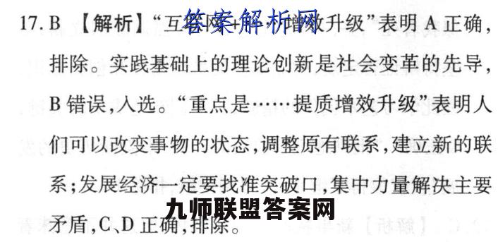 17.B【解析】“互联网+…增效升级”表明A正确,排除。实践基础上的理论创新是社会变革的先导,B错误,入选。“重点是…提质增效升级”表明人们可以改变事物的状态,调整原有联系,建立新的联系;发展经济一定要找准突破口,集中力量解决主要矛盾,C、D正确,排除。