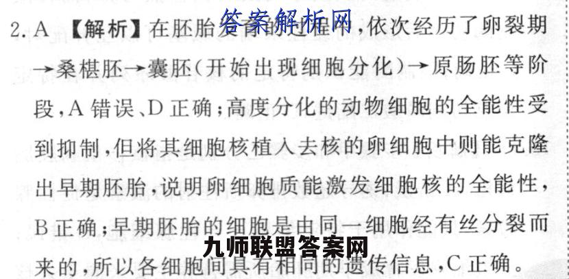 2.A【解析】在胚胎发育的过程中,依次经历了卵裂期→桑椹胚→囊胚(开始出现细胞分化)→原肠胚等阶段,A错误、D正确;高度分化的动物细胞的全能性受到抑制,但将其细胞核植入去核的卵细胞中则能克隆出早期胚胎,说明卵细胞质能激发细胞核的全能性,B正确;早期胚胎的细胞是由同一细胞经有丝分裂而来的,所以各细胞间具有相同的遗传信息,C正确。