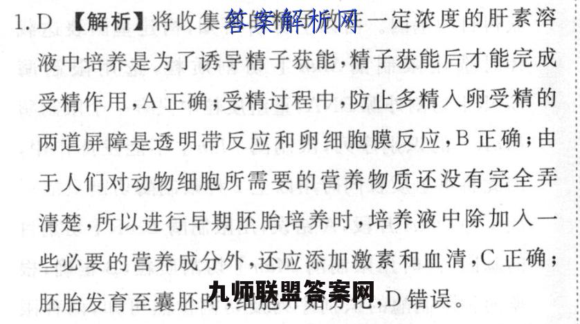 1.D【解析】将收集到的精子放在一定浓度的肝素溶液中培养是为了诱导精子获能,精子获能后才能完成受精作用,A正确;受精过程中,防止多精入卵受精的两道屏障是透明带反应和卵细胞膜反应,B正确;由于人们对动物细胞所需要的营养物质还没有完全弄清楚,所以进行早期胚胎培养时,培养液中除加入一些必要的营养成分外,还应添加激素和血清,C正确:胚胎发育至囊胚时,细胞开始分化,D错误。