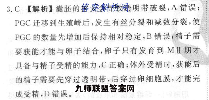 3.C【解析】囊胚的扩大会导致透明带破裂,A错误;PGC迁移到生殖嵴后,发生有丝分裂和减数分裂,使PGC的数量先增加后保持相对稳定,B错误;精子需要获能才能与卵子结合,卵子只有发育到MⅡ期才具备与精子受精的能力,C正确;体外受精时,获能后的精子需要先穿过透明带,后穿过卵细胞膜,才能完成受精,D错误。