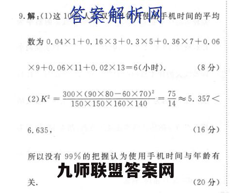 9.解:(1)这1000人在双休日每天使用手机时间的平均数为0.04×1+0.16×3+0.3×5十0.36×7+0.06×9+0.06×11+0.02×13=6(小时).(8分)(2)K2=300×(90×80-60×70)2_7150×150×160×14014≈5.357<6.635,(16分)所以没有99%的把握认为使用手机时间与年龄有关.(20分)