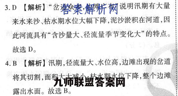 3.D【解析】“岔道众多,边滩广布”说明汛期有大量来水来沙、枯水期水位大幅下降,泥沙淤积在河道,因此河流具有“含沙量大、径流量季节变化大”的特点。故选D。4.B【解析】汛期,径流量大、水位高,边滩出现的岔道将其切割,面积大大减小;枯水期水位下降,整个边滩露出水面。故选B。