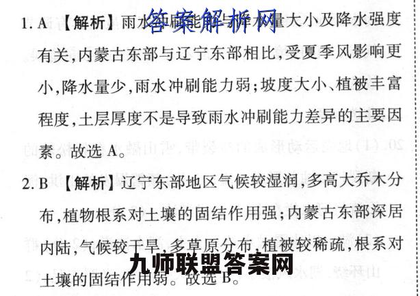 1.A【解析】雨水冲刷能力与降水量大小及降水强度有关,内蒙古东部与辽宁东部相比,受夏季风影响更小,降水量少,雨水冲刷能力弱;坡度大小、植被丰富程度,土层厚度不是导致雨水冲刷能力差异的主要因素。故选A。12.B【解析】辽宁东部地区气候较湿润,多高大乔木分布,植物根系对土壤的固结作用强;内蒙古东部深居内陆,气候较干旱,多草原分布,植被较稀疏,根系对土壤的固结作用弱。故选B。