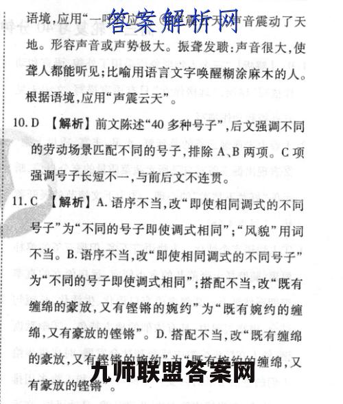 9.B【解析】①如火如茶:原形容军容之盛,后用来形容气势旺盛或热烈。如日中天:好像中午时的太阳,比喻事物正在最兴盛的时候。根据语境,应用“如火如茶”。②蜚声中外:扬名中外,享誉全球。震古烁今:震动古代,显耀当世。形容事业或功绩的伟大。根据语境,应用“蜚声中外”。③一呼百应:一声召唤,群起响应。形容威信高,响应者多。一呼百诺:一人呼唤,百人应答。形容有钱有势,仆从很多。根据语境,应用“一呼百应”。④声震云天:声音震动了天地。形容声音或声势极大。振聋发聩:声音很大,使聋人都能听见;比喻用语言文字唤醒糊涂麻木的人。根据语境,应用“声震云天”。10.D【解析】前文陈述“40多种号子”,后文强调不同的劳动场景匹配不同的号子,排除A、B两项。C项强调号子长短不一,与前后文不连贯。11.C【解析】A.语序不当,改“即使相同调式的不同号子”为“不同的号子即使调式相同”;“风貌”用词不当。B.语序不当,改“即使相同调式的不同号子”为“不同的号子即使调式相同”;搭配不当,改“既有缠绵的豪放,又有铿锵的婉约”为“既有婉约的缠绵,又有豪放的铿锵”。D.搭配不当,改“既有缠绵的豪放,又有铿锵的婉约”为“既有婉约的缠绵,又有豪放的铿锵”。