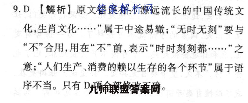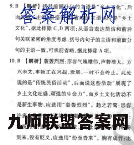 9.B【解析】括号前面分句的主语是“乡土文化”,后而省略了主语,根据语意,省略的主语也应是“乡土文化”,据此排除C,D两项;从语言表达简洁和前后句关联紧密的角度考虑,括号内句子的主语和前面分句的主语一致,可承前省略,据此排除A项。10.B【解析】麦轰烈烈:形容气魏雄伟,声势若大。方兴未艾:事物正在兴起、发展,一时不会终止。此处说的是“传统民俗话动“,后而说这些话动“展现了乡土文化旺盛、顽强的生命力”,而乡土文化活动不是新生事物,应选用“表轰烈烈”。趋之若度:形容许多人争着去追逐某种事物(含贬义)。纷至香来:纷纷到来:连续不断地到来。此处是形容人们纷粉到来,没有贬义,应选用“粉至香来”。胸有成竹:比喻做事之前已经有通盘的考虑。踌躇满志:形容对自己的现状或取得的成就非常得意。根据前后语境,此处是说“中国乡土文化”已经取得了成就,应选用“请躇满志”。第四处,饱经风霜:形容经历过很多艰难困苦。饱经沧桑:形容经历过很多世事变迁。此处前面说“中国乡土文化历经劫难面不亡”,应选用“饱经风霜”。11,B【解析】画线句子有两处语病:①~保持乡土文化、传承乡村特色”搭配不当,应改为“传承乡土文化、保持乡村特色”:②“一致共识”成分赘余,副掉“一致”。综合分析,B项修改最恰当。