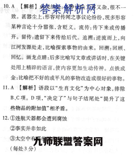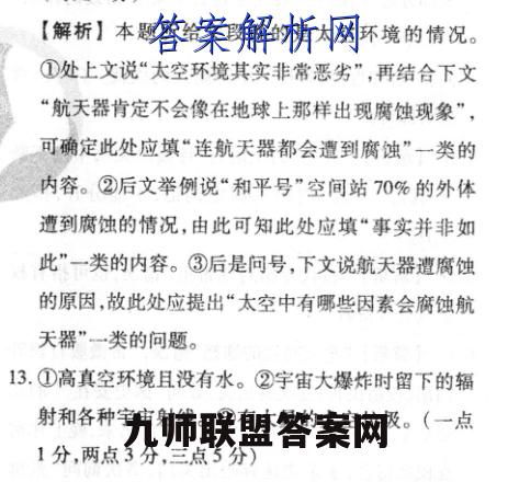 9.D【解析】原文错误有:“源远流长的中国传统文化,生肖文化…”属于中途易辙;“无时无刻”要与“不”合用,用在“不”前,表示“时时刻刻都…”之意;“人们生产、消费的赖以生存的各个环节”属于语序不当。只有D项全部修改正确。【解析】本题所给文段说的是太空环境的情况。①处上文说“太空环境其实非常恶劣”,再结合下文“航天器肯定不会像在地球上那样出现腐蚀现象”,可确定此处应填“连航天器都会遭到腐蚀”一类的内容。②后文举例说“和平号”空间站70%的外体遭到腐蚀的情况,由此可知此处应填“事实并非如此”一类的内容。③后是问号,下文说航天器遭腐蚀的原因,故此处应提出“太空中有哪些因素会腐蚀航天器”一类的问题。13.①高真空环境且没有水。②宇宙大爆炸时留下的辐射和各种宇宙射线。③有大量的太空垃圾。(一点1分,两点3分,三点5分)