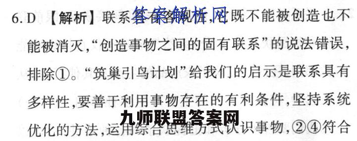 6.D【解析】联系具有客观性,它既不能被创造也不能被消灭,“创造事物之间的固有联系”的说法错误排除①。“筑巢引鸟计划”给我们的启示是联系具有多样性,要善于利用事物存在的有利条件,坚持系统优化的方法,运用综合思维方式认识事物,②④符合题意。尊重客观规律,按客观规律办事是我们进行社会实践的前提和基础,③说法错误。