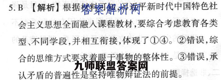 5.B【解析】根据材料可知,主席新时代中国特色社会主义思想全面融人课程教材,要综合考虑教育各类型、不同学段,并相互衔接,体现了①④。②错误,综合的思维方式要求着眼于事物的整体性。③错误,承认矛盾的普遍性是坚持唯物辩证法的前提