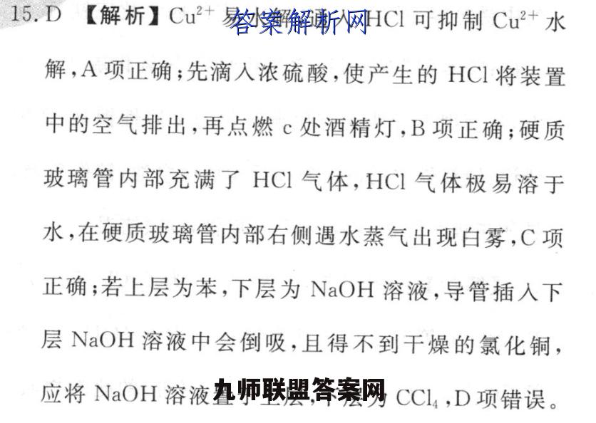 15.D【解析】Cu2+易水解,通入HCl可抑制Cu2+水解,A项正确;先滴入浓硫酸,使产生的HC1将装置中的空气排出,再点燃℃处酒精灯,B项正确;硬质玻璃管内部充满了HC1气体,HCI气体极易溶于水,在硬质玻璃管内部右侧遇水蒸气出现白雾,C项正确;若上层为苯,下层为NaOH溶液,导管插入下层NaOH溶液中会倒吸,且得不到干燥的氯化铜,应将NaOH溶液置于上层,下层为CCl4,D项错误。
