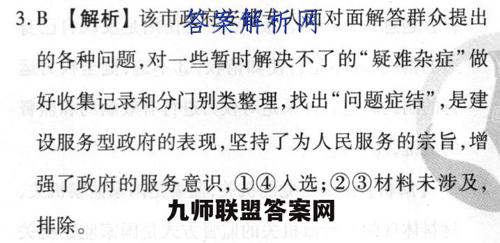 3.B【解析】该市政府安排专人面对面解答群众提出的各种问题,对一些暂时解决不了的“疑难杂症”做好收集记录和分门别类整理,找出“问题症结”,是建设服务型政府的表现,坚持了为人民服务的宗旨,增强了政府的服务意识,①④入选;②③材料未涉及,排除。