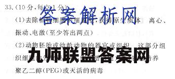 33.(10分,每空1分)(1)去除植物细胞的细胞壁,获得原生质体离心、振动、电激(至少答出两点)(2)动物胚胎或幼龄动物的器官或组织这部分组织细胞的分化程度低,细胞增殖能力强,容易培养聚乙二醇(PEG)或灭活的病毒(3)透明带反应(4)显微注射技术奶牛乳腺蛋白基因的启动子(5)激素和动物血清防止杂菌污染【解析】(1)若A、B为植物细胞,细胞最外面是细胞壁,在细胞融合之前应用纤维素和果胶前处理,除去细胞壁获得原生质体;A、B到C的过程为细胞融合,常用的物理方法是离心、振动,电激。(2)若A、B是动物细胞,细胞一般取自动物胚胎或幼龄动物的器官或组织,由于动物胚胎或幼龄动物的器官或组织细胞的分化程度低,细胞增殖能力强,容易培养,所以动物细胞培养时一般取动物胚胎或幼龄动物的器官或组织:从A,B到C的过程中常用聚乙二醇(PEG)或灭活的病毒诱导融合。(3)防止多精入卵的第一道屏障是透明带反应。(4)将目的基因导人动物细胞最有效的方法是显微注射法。若要使人的血清白蛋白基因在牛的乳腺细胞中表达,导入基因前,需要将血清白蛋白基因与奶牛乳腺蛋白基因的启动子等调控组件重组在一起:(5)早期胚胎体外培养时,培养液中除了含有各种无机盐和有机盐,维生素、氨基酸、核苷酸等营养成分外,还需要添加激素和动物血清。一股情况下,通常在合成培养基中加入一定量的抗生素,其目的是防止杂菌污染。