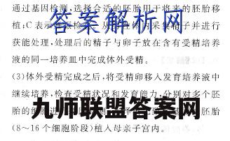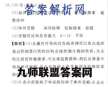 31.(10分,每空1分)(1)基因通过控制蛋白质的结构促性腺激素超数排卵(2)体外受精基因检测妊娠检查获能(3)受精状况和发育能力8一16子宫【解析】(1)从囊性纤维病的发病原理可以看出基因通过控制蛋白质的结构直接控制生物的性状,为女性注射促性腺激素,可实现超数排卵,然后从卵巢中吸取卵母细胞,并在显微镜下将其移到含特殊培养液的培养皿中.置于37℃培养箱中培养:(2)A表示获能精子和成熟的卵子休外受精:B表示通过基因检测,选择合适的胚胎用于将来的胚胎移植:C表示妊娠检查。从男性体内采集精子并进行获能处理,处理后的精子与卵子放在含有受精培养液的同一培养皿巾完成体外受精。(3)体外受精完成之后,将受精卵移入发育培养液中继续培养,检查受精状况和发有能力,分别对多个胚胎的细胞进行基因检测,选择出无致病基因的胚胎(8~16个细胞阶段)植入母亲子宫内。