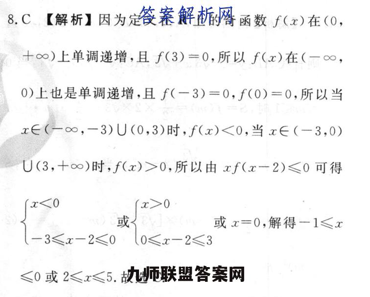 8.C【解析】因为定义在R上的奇函数f(x)在(0,+∞)上单调递增,且f(3)=0,所以f(x)在(一∞,0)上也是单调递增,且f(一3)=0,f(0)=0,所以当x∈(-∞,-3)U(0,3)时,f(x)<0,当x∈(-3,0)U(3,十∞)时,f(x)>0,所以由xf(x一2)≤0可得x<0x>0或(或x=0,解得一1≤x-3≤x-2≤00≤x-2≤3≤0或2≤x≤5.故选C.