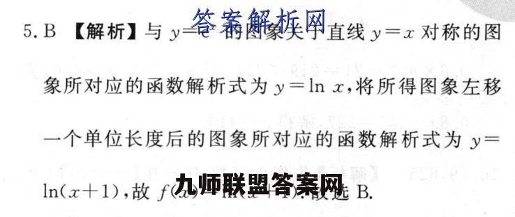 5.B【解析】与y=e的图象关于直线y=x对称的图象所对应的函数解析式为y=1nx,将所得图象左移一个单位长度后的图象所对应的函数解析式为y=ln(x+1),故f(x)=ln(x+1).故选B.
