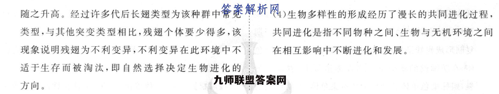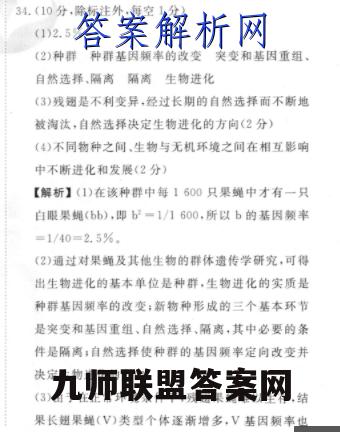 34.(10分,除标注外,每空1分)(1)2.5%(2)种群种群基因频率的改变突变和基因重组、自然选择,隔离隔离生物进化(3)残翅是不利变异,经过长期的自然选择而不断地被淘汰,自然选择决定生物进化的方向(2分)(4)不同物种之间、生物与无机环境之间在相互影响中不断进化和发展(2分)【解析】(1)在该种群中每1600只果蝇中才有一只白眼果绳(bb),即b2=1/1600,所以b的基因频率=1/40=2.5%.(2)通过对果蝇及其他生物的群体遗传学研究,可得出生物进化的基本单位是种群,生物进化的实质是种群基因频率的改变:新物种形成的三个基本环节是突变和基因重组、自然选择,隔离,其中必要的条件是隔离,自然选择使种群的基因频率定向改变并决定生物进化的方向(3)由于在正常环境条件下,残翅果蝇难以生存,结果长翅果蝇(V)类型个体逐渐增多,V基因频率也随之升高。经过许多代后长翅类型为该种群中常见(4)生物多样性的形成经历了漫长的共同进化过程,类型,与其他突变类型相比,残翅个体要少得多,该共同进化是指不同物种之间、生物与无机环境之间现象说明残翅为不利变异,不利变异在此环境中不在相互影响中不断进化和发展。适于生存而被淘汰,即自然选择决定生物进化的方向。