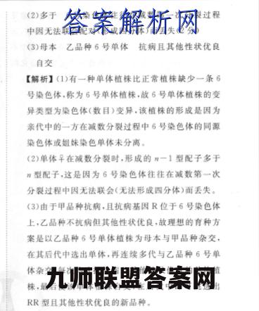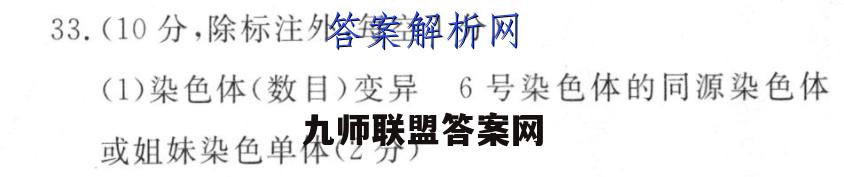 33.(10分,除标注外,每空1分)(1)染色体(数目)变异6号染色体的同源染色体或姐妹染色单体(2分)(2)多于6号染色体往往在减数第一次分裂过程中因无法联会配对(形成四分体)而丢失(2分)(3)母本乙品种6号单体抗病且其他性状优良自交【解析】(1)有一种单体植株比正常植株缺少一条6号染色体,称为6号单体植株,故6号单体植株的变异类型为染色体(数目)变异,该植株的形成是因为亲代中的一方在减数分裂过程中6号染色体的同源染色体或姐妹染色单体未分离。(2)单体早在减数分裂时,形成的一1型配子多于m型配子,这是因为6号染色体往往在减数第一次分裂过程中因无法联会(无法形成四分体)而丢失。(3)由于甲品种抗病,且抗病基因R位于6号染色体上,乙品种不抗病但其他性状优良,故理想的育种方案是以乙品种6号单体植株为母本与甲品种杂交,在其后代中选出单体,再连续多代与乙品种6号单体杂交,每次均选择抗病且其他性状优良的单体植株,最后使该单体植株自交,在后代中即可挑选出RR型且其他性状优良的新品种。